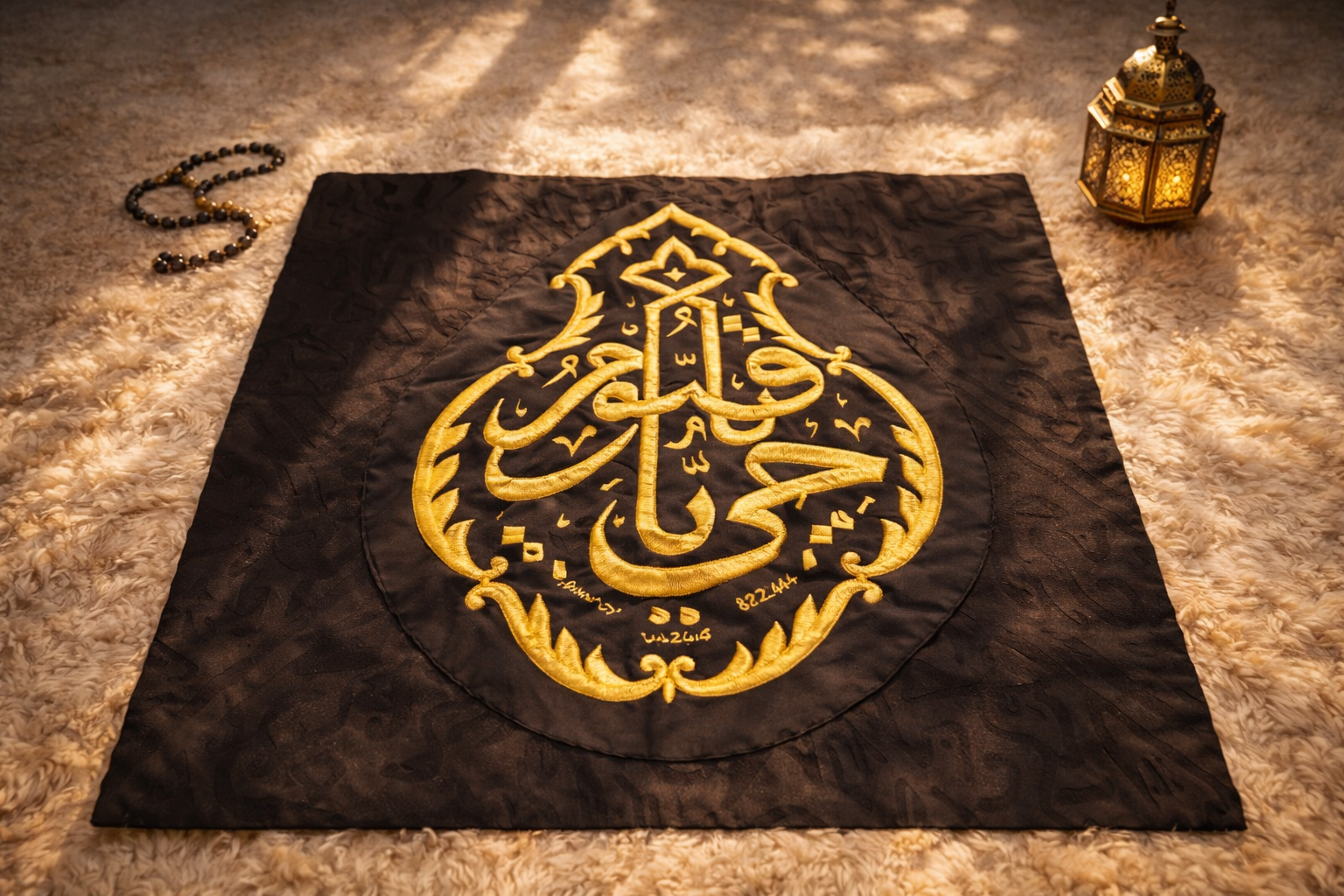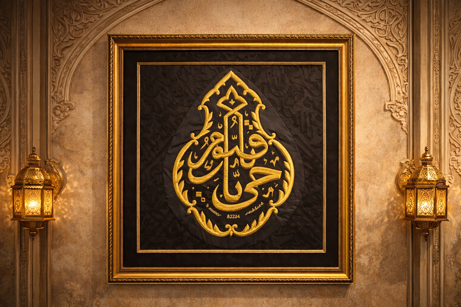 This original Kaaba Qandeel panel features the blessed phrase “Ya Hayyu Ya Qaiyoom”, intricately embroidered using gold-polished copper wire on sacred Kiswah fabric.