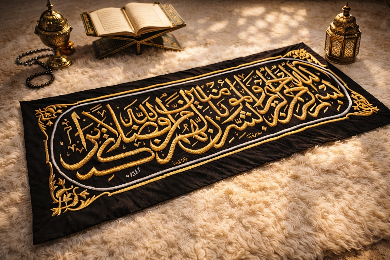 Crafted from a premium silk-polyester blend and embroidered using gold-polished copper wire, this Kiswah belt piece reflects the spiritual and artistic significance of the Kaaba covering.