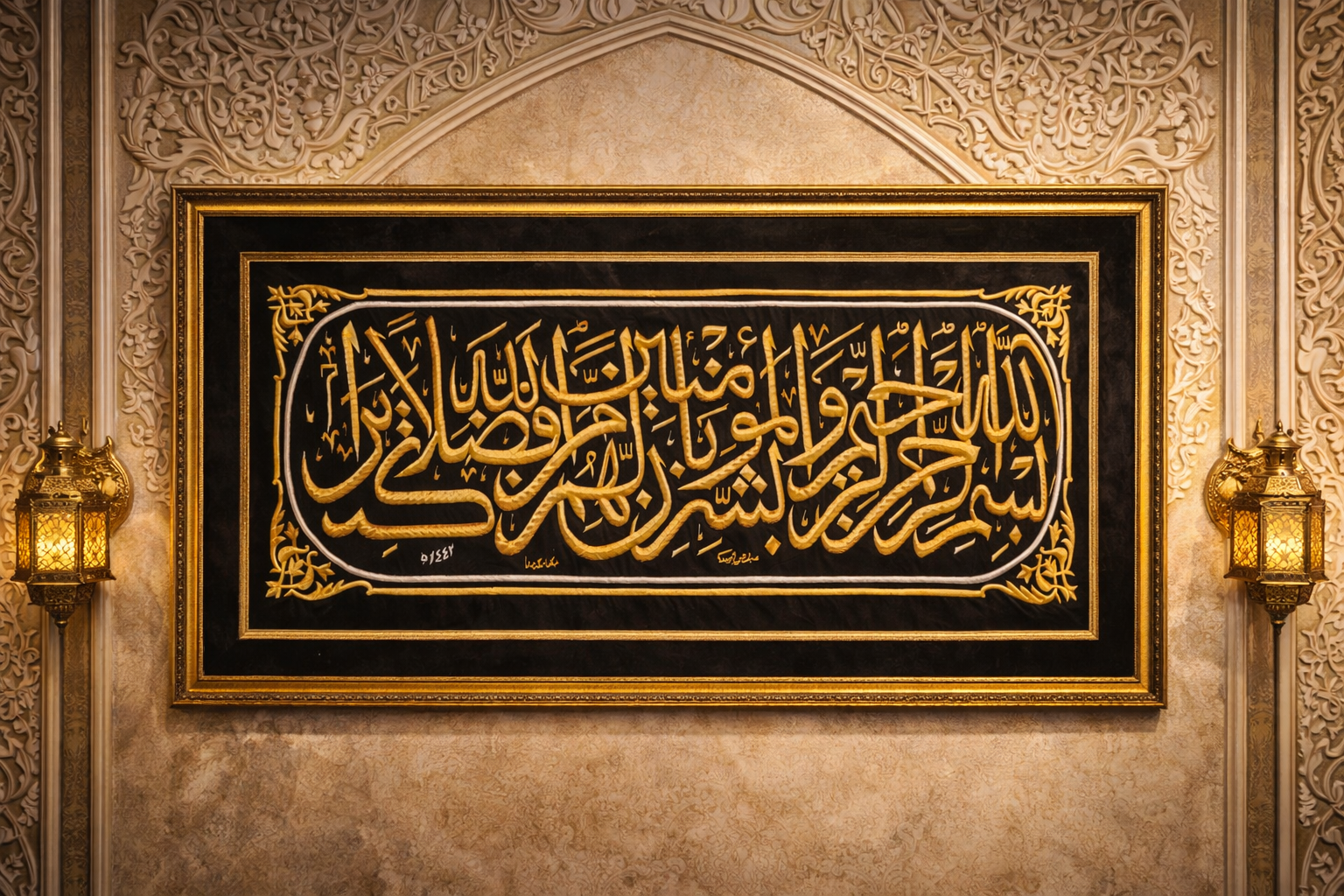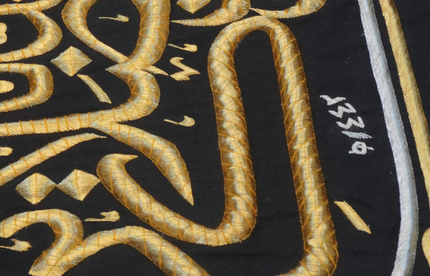 A sacred preserved segment from the Holy Kaaba Kiswah belt, bearing the Quranic inscription “Wabashshiril Momineen”. This rare textile was installed during 1442 Hijri in the King Salman era.