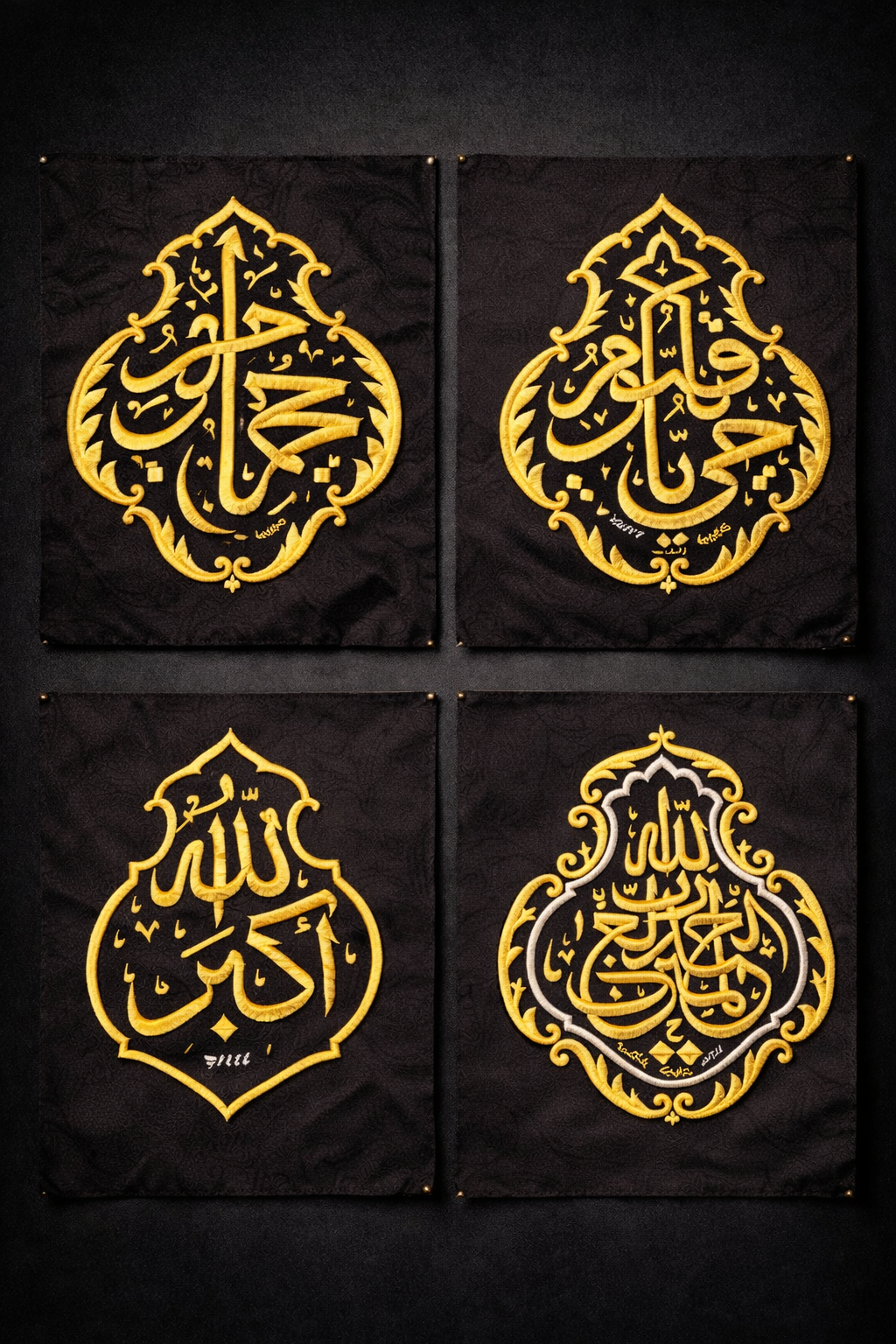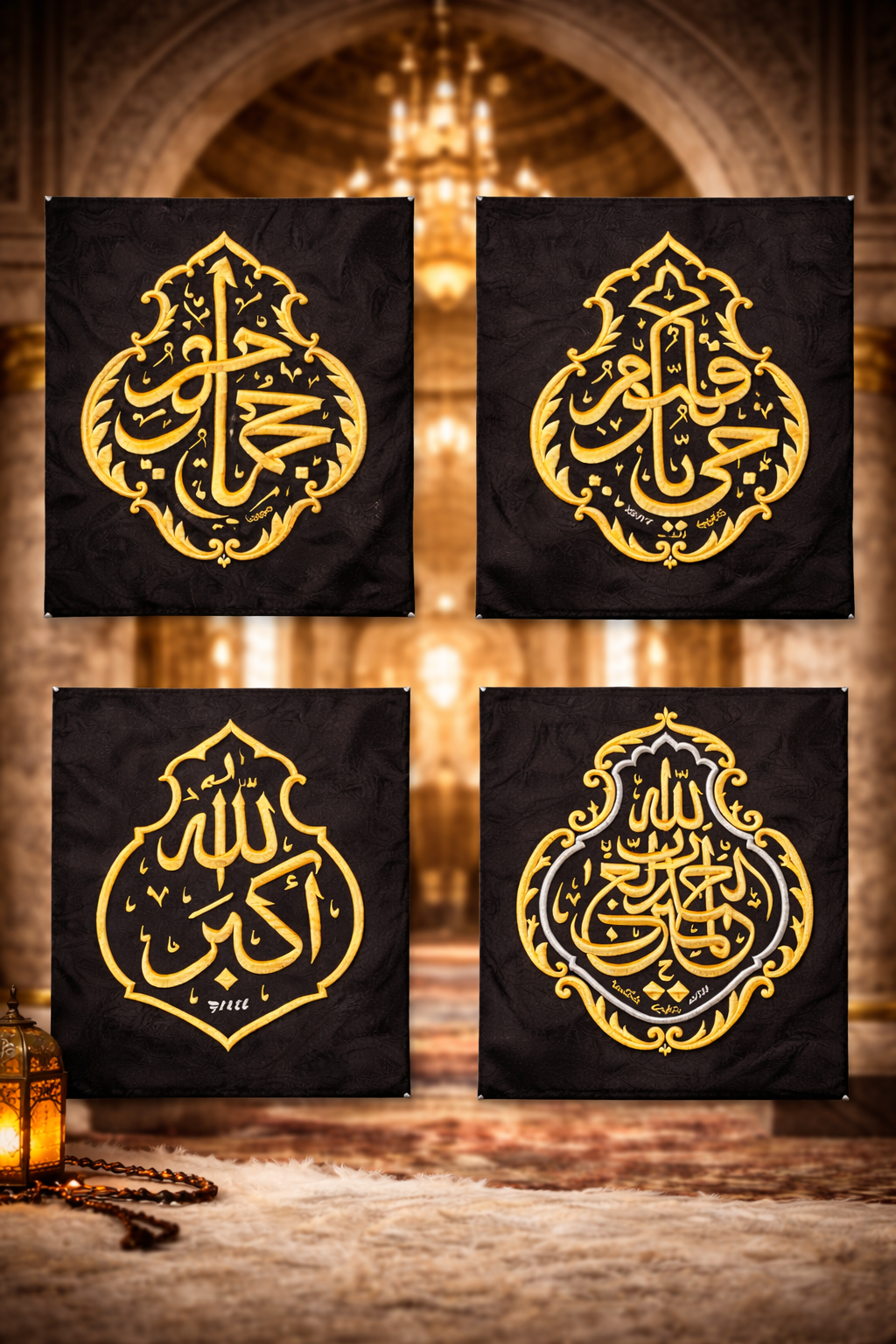 This 4-piece Kaaba Fabric Qandeel Combo Set represents a rare preserved segment of the Holy Kaaba Kiswah. Designed with intricate Islamic embroidery, these panels serve as a meaningful Islamic heritage collectible.